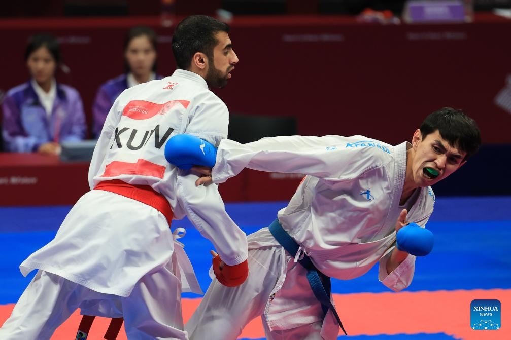 Abdullah Shaaban (L) of Kuwait competes against Kaisar Alpysbat of Kazakhstan during the Men's Kumite -60kg Gold Medal Contest of Karate at the 19th Asian Games in Hangzhou, east China's Zhejiang Province, Oct. 6, 2023. (Xinhua/Jiang Han)