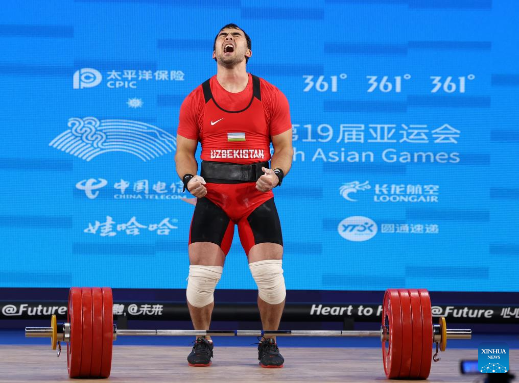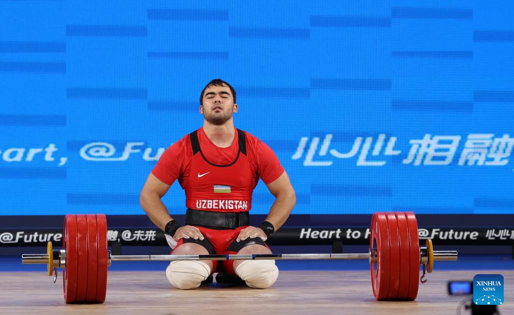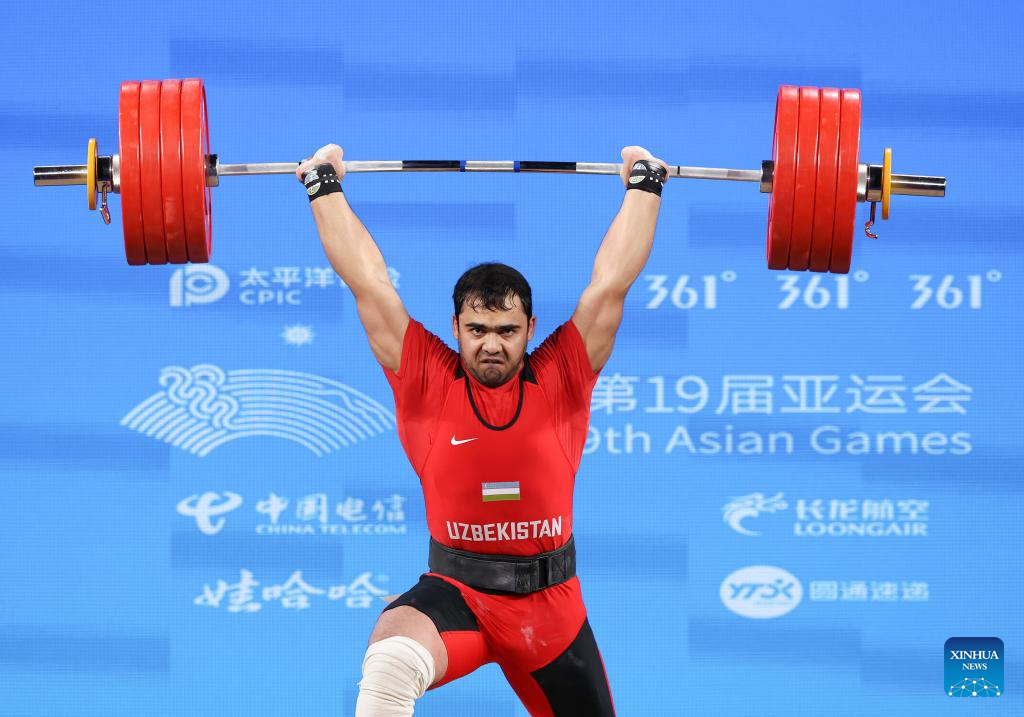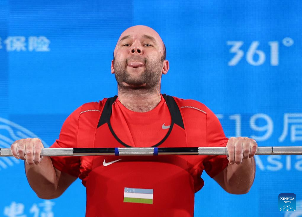 Akbar Djuraev of Uzbekistan competes during Men's 109Kg Group A match of Weightlifting at the 19th Asian Games in Hangzhou, east China's Zhejiang Province, Oct. 6, 2023. (Xinhua/Yang Lei)