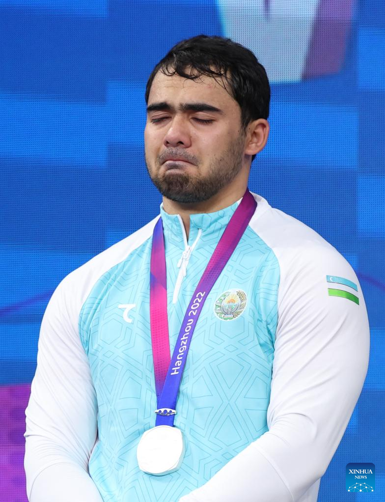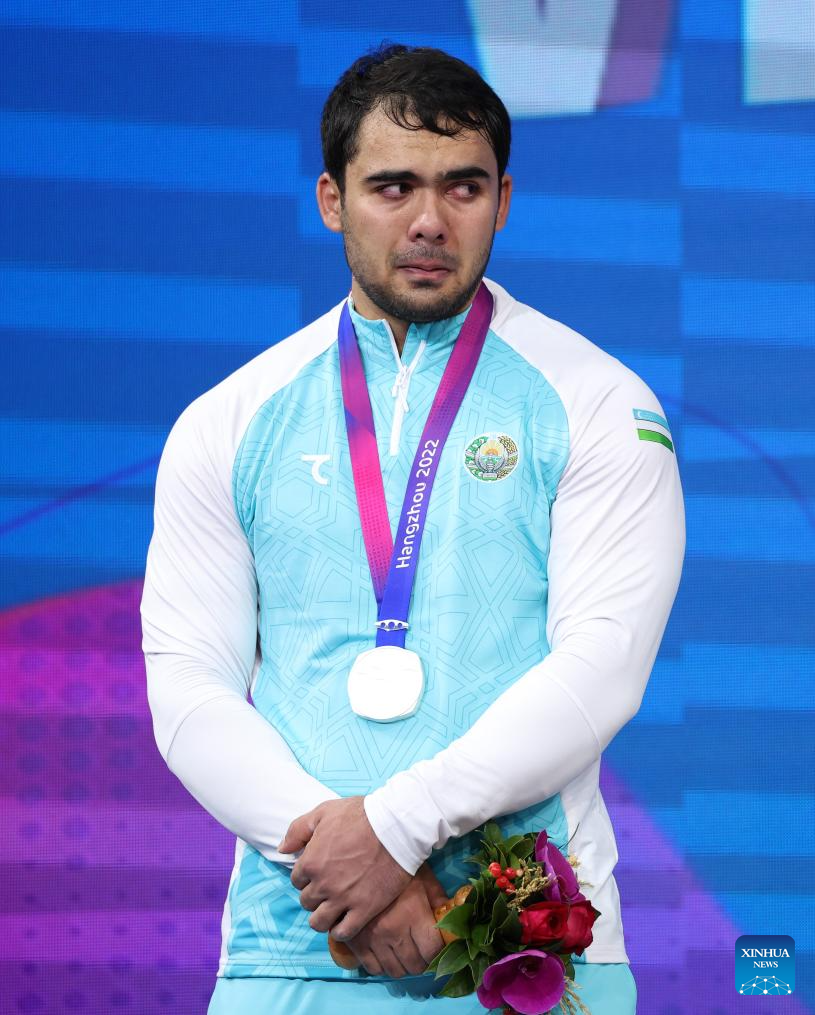 Silver Medalist Akbar Djuraev of Uzbekistan attends the awarding ceremony for Men's 109Kg of Weightlifting at the 19th Asian Games in Hangzhou, east China's Zhejiang Province, Oct. 6, 2023. (Xinhua/Yang Lei)