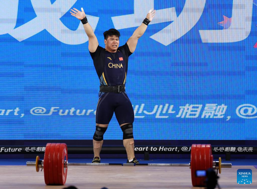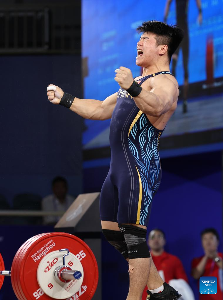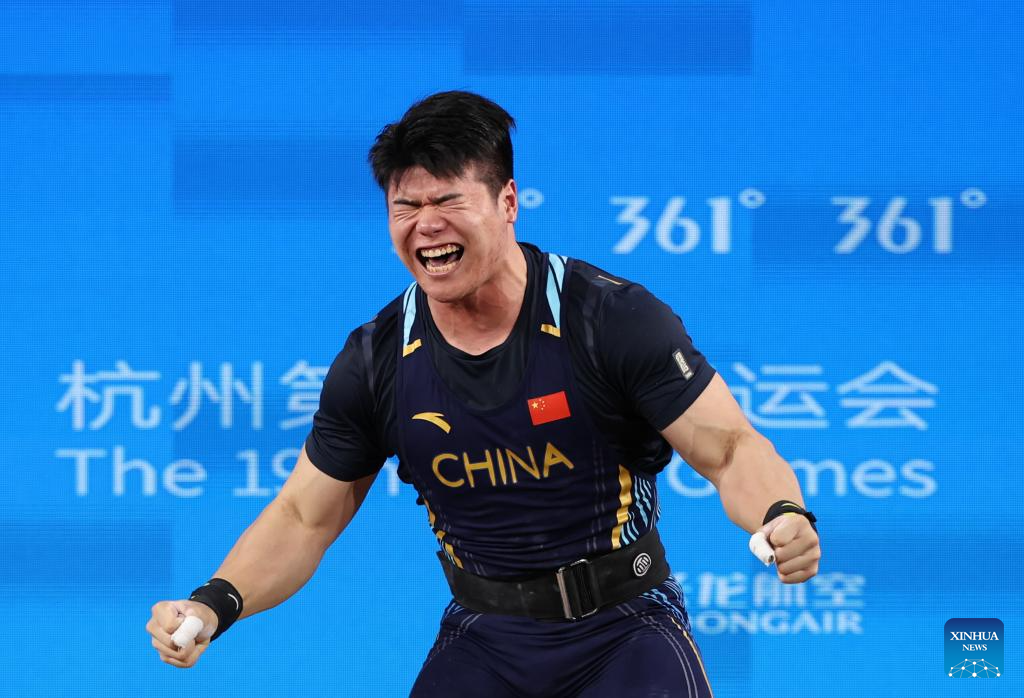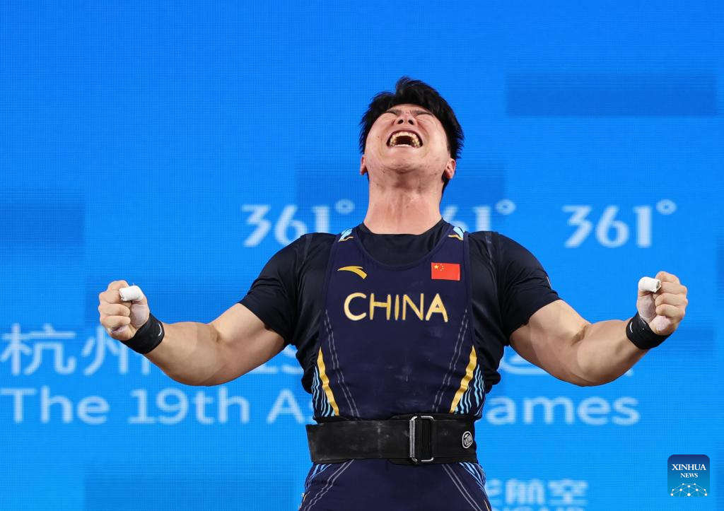 Liu Huanhua of China reacts during Men's 109Kg Group A match of Weightlifting at the 19th Asian Games in Hangzhou, east China's Zhejiang Province, Oct. 6, 2023. (Xinhua/Yang Lei)