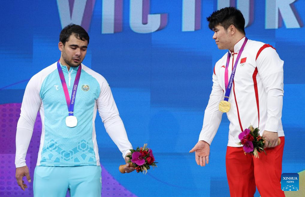 Gold Medalist Liu Huanhua (R) of China and Silver Medalist Akbar Djuraev of Uzbekistan attend the awarding ceremony for Men's 109Kg of Weightlifting at the 19th Asian Games in Hangzhou, east China's Zhejiang Province, Oct. 6, 2023. (Xinhua/Yang Lei)