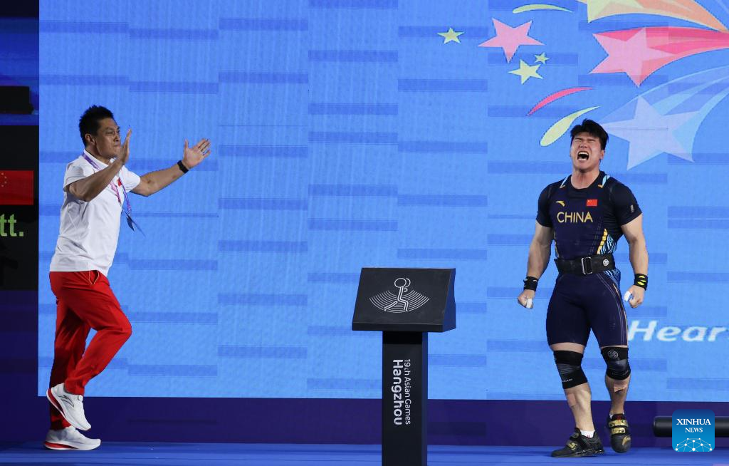 Liu Huanhua (R) of China reacts during Men's 109Kg Group A match of Weightlifting at the 19th Asian Games in Hangzhou, east China's Zhejiang Province, Oct. 6, 2023. (Xinhua/Yang Lei)