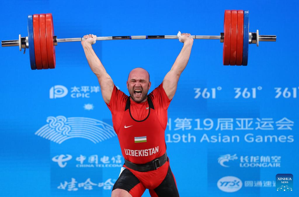 Ruslan Nurudinov of Uzbekistan competes during Men's 109Kg Group A match of Weightlifting at the 19th Asian Games in Hangzhou, east China's Zhejiang Province, Oct. 6, 2023. (Xinhua/Yang Lei)