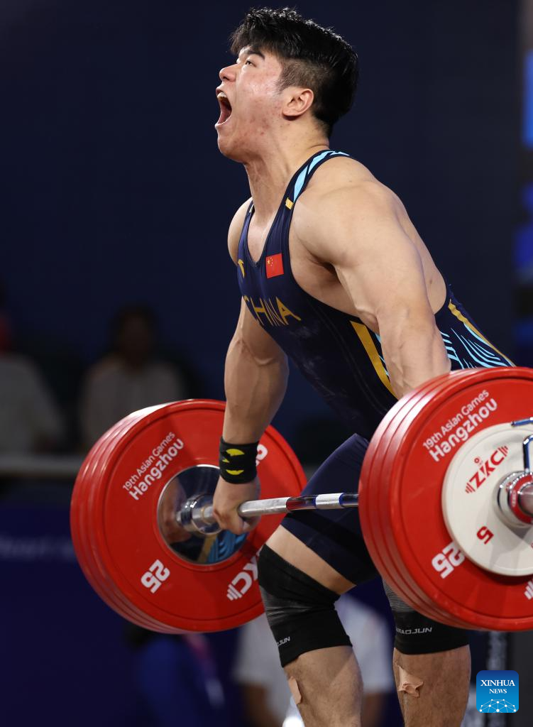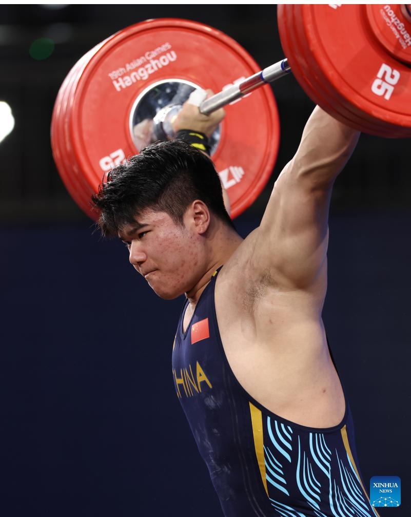 Liu Huanhua of China competes during Men's 109Kg Group A match of Weightlifting at the 19th Asian Games in Hangzhou, east China's Zhejiang Province, Oct. 6, 2023. (Xinhua/Yang Lei)