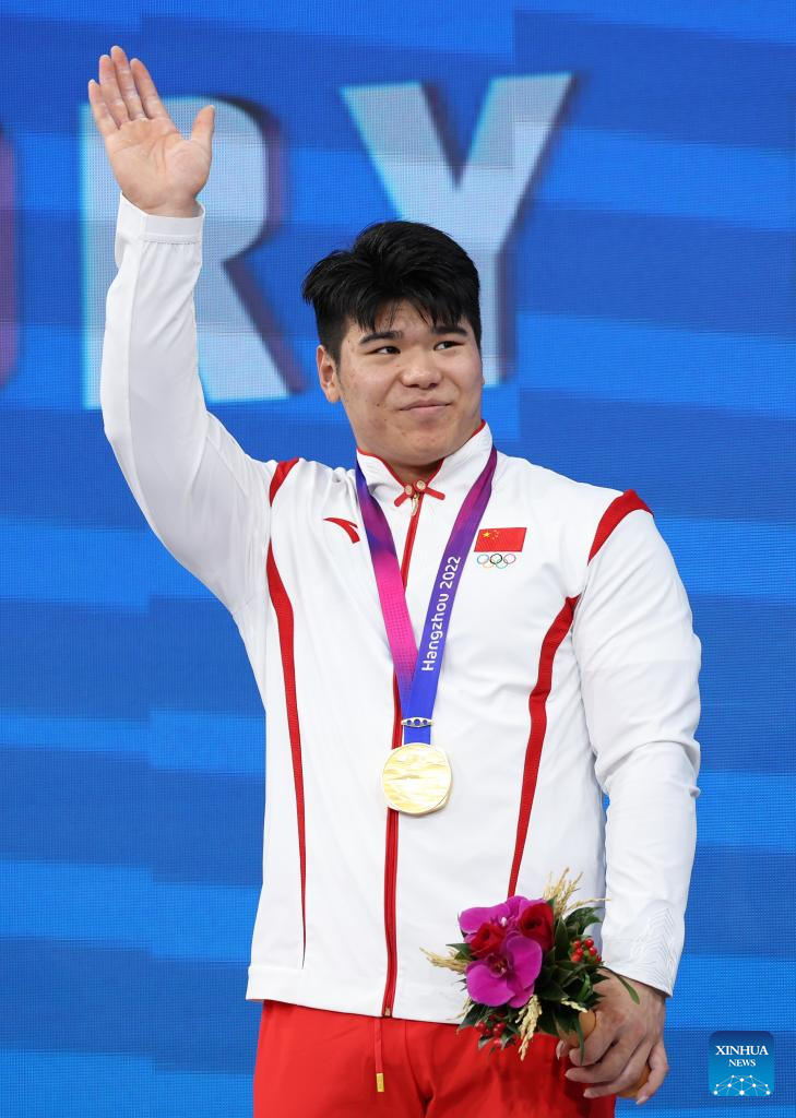 Gold Medalist Liu Huanhua of China attends the awarding ceremony for Men's 109Kg of Weightlifting at the 19th Asian Games in Hangzhou, east China's Zhejiang Province, Oct. 6, 2023. (Xinhua/Yang Lei)