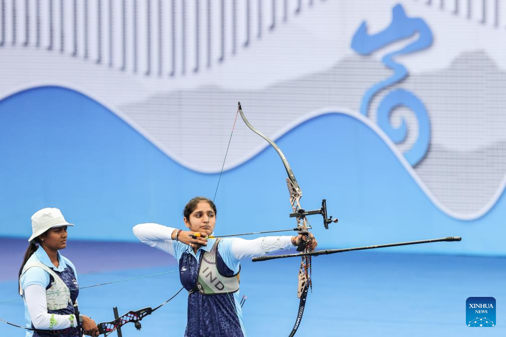 Bhajan Kaur (R) of India competes during the Recurve Women's Team Bronze Medal Match of Archery between India and Vietnam at the 19th Asian Games in Hangzhou, east China's Zhejiang Province, Oct. 6, 2023. (Xinhua/Shan Yuqi)
