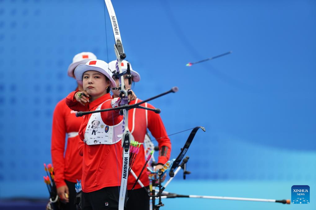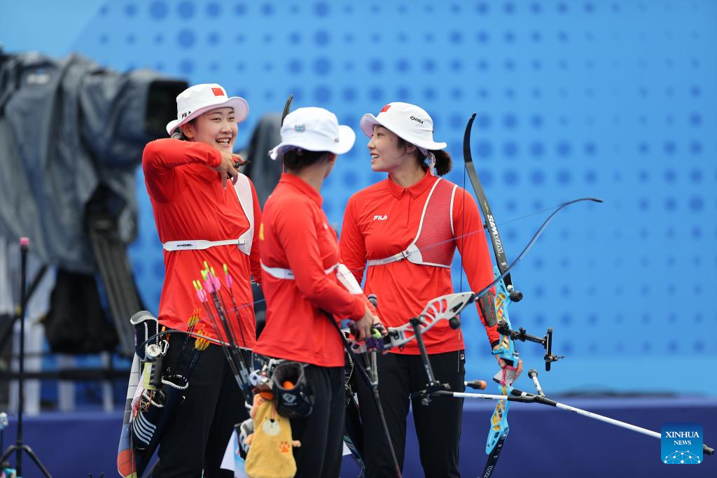Team China communicate during the Recurve Women's Team Gold Medal Match of Archery between China and South Korea at the 19th Asian Games in Hangzhou, east China's Zhejiang Province, Oct. 6, 2023. (Xinhua/Guo Yu)