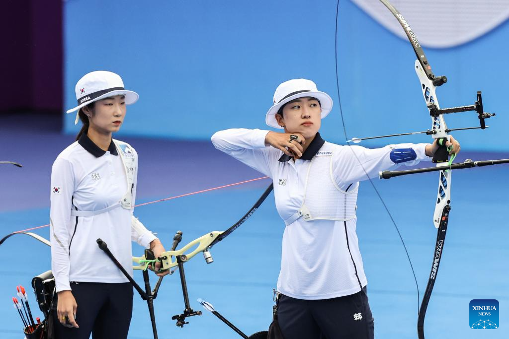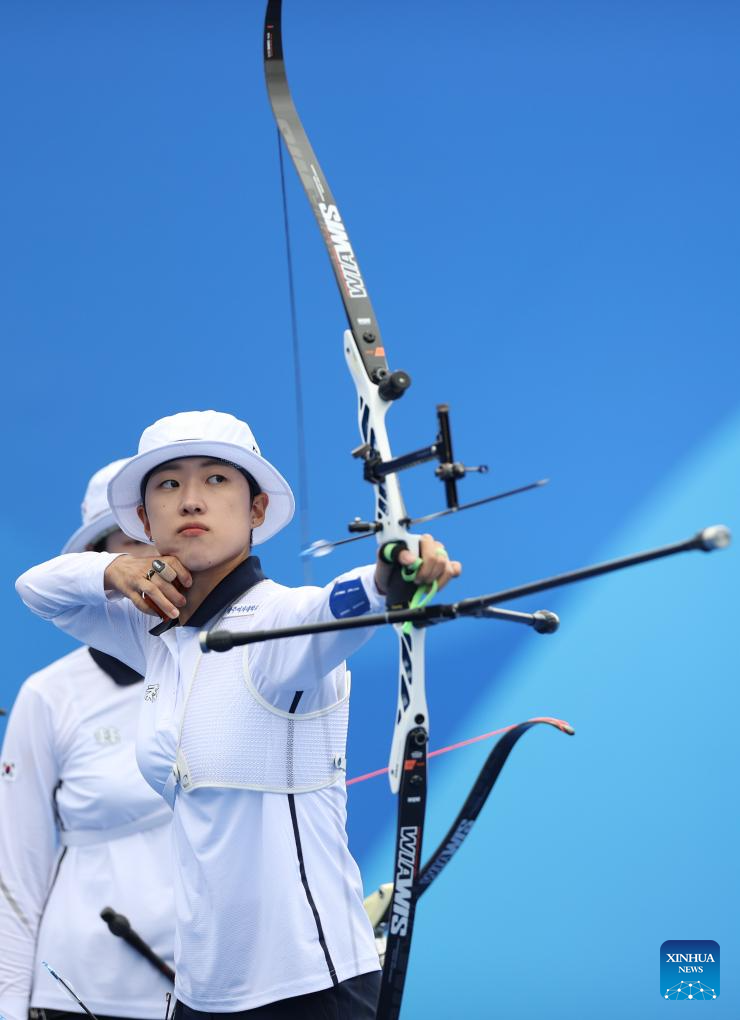 An San of South Korea competes during the Recurve Women's Team Gold Medal Match of Archery between China and South Korea at the 19th Asian Games in Hangzhou, east China's Zhejiang Province, Oct. 6, 2023. (Xinhua/Shan Yuqi)