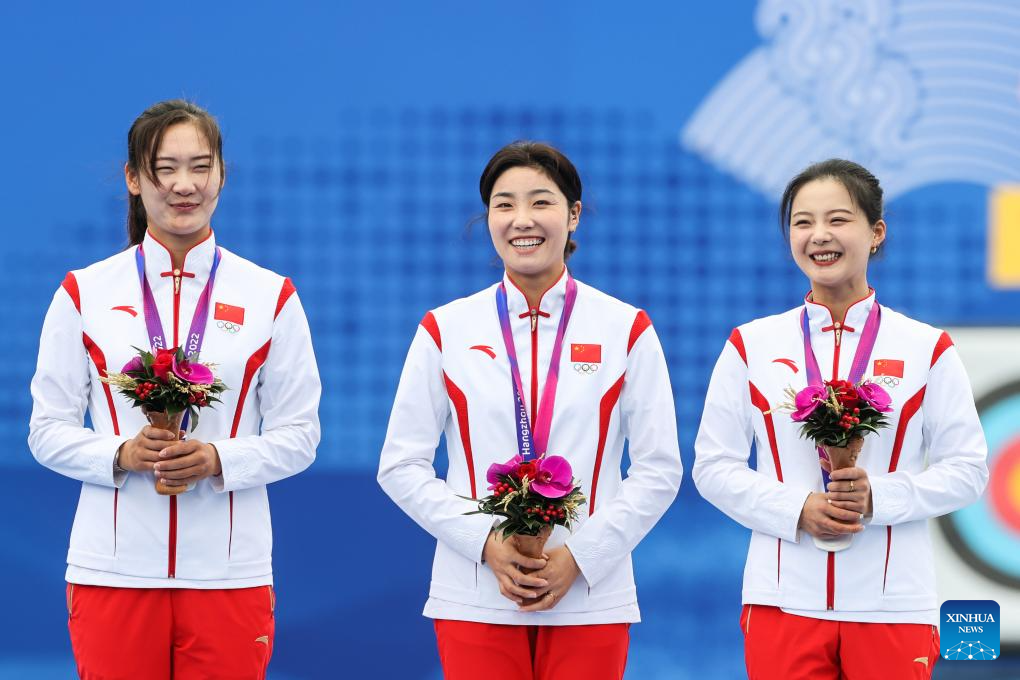 Silver medalists Team China attend the awarding ceremony for the Recurve Women's Team of Archery at the 19th Asian Games in Hangzhou, east China's Zhejiang Province, Oct. 6, 2023. (Xinhua/Shan Yuqi)