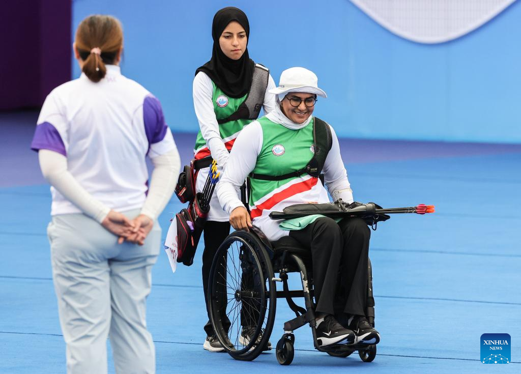 Yasna Pourmahani (C) and Zahra Nemati of Iran enter the venue during the Recurve Women's Team Quarterfinal of Archery between China and Iran at the 19th Asian Games in Hangzhou, east China's Zhejiang Province, Oct. 6, 2023. (Xinhua/Shan Yuqi)