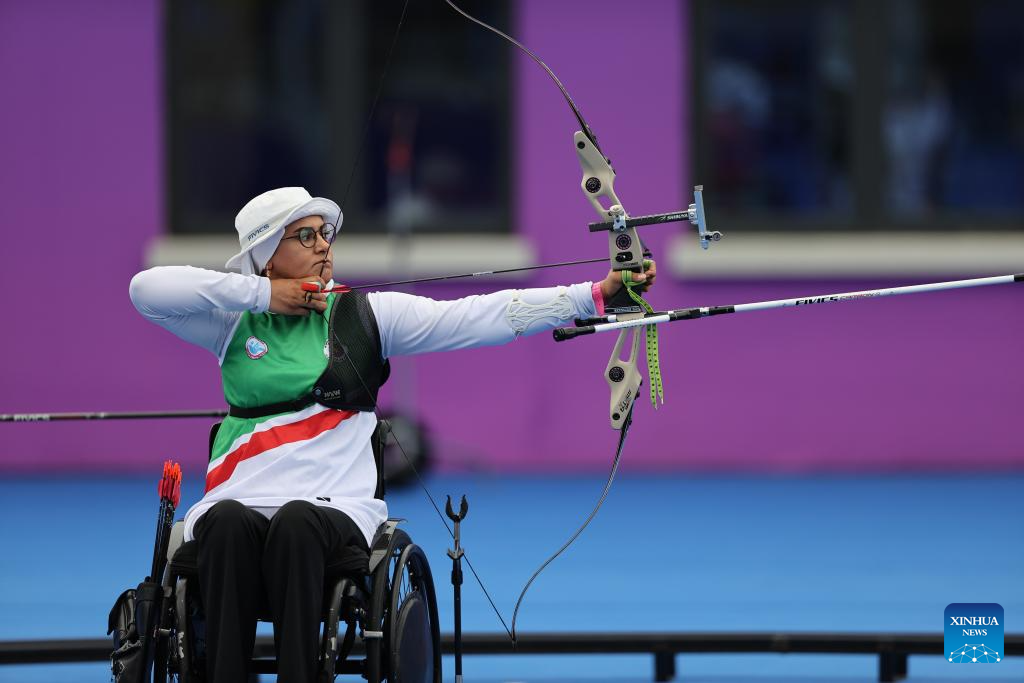 Zahra Nemati of Iran competes during the Recurve Women's Team Quarterfinal of Archery between China and Iran at the 19th Asian Games in Hangzhou, east China's Zhejiang Province, Oct. 6, 2023. (Xinhua/Guo Yu)