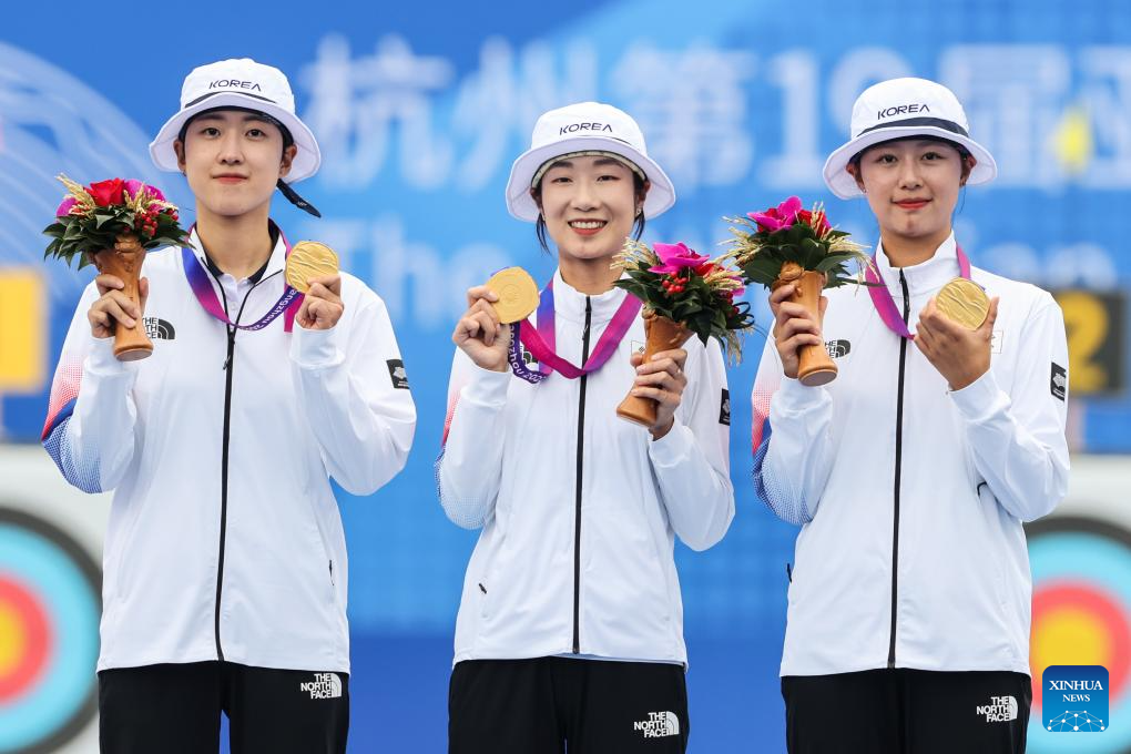 Gold medalists Team South Korea attend the awarding ceremony for the Recurve Women's Team of Archery at the 19th Asian Games in Hangzhou, east China's Zhejiang Province, Oct. 6, 2023. (Xinhua/Shan Yuqi)