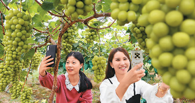 Staff members of the supply and marketing cooperative of Lu'an shoot short videos at a local grape planting base in Lu'an city, east China's Anhui Province. (Photo/Chen Li)