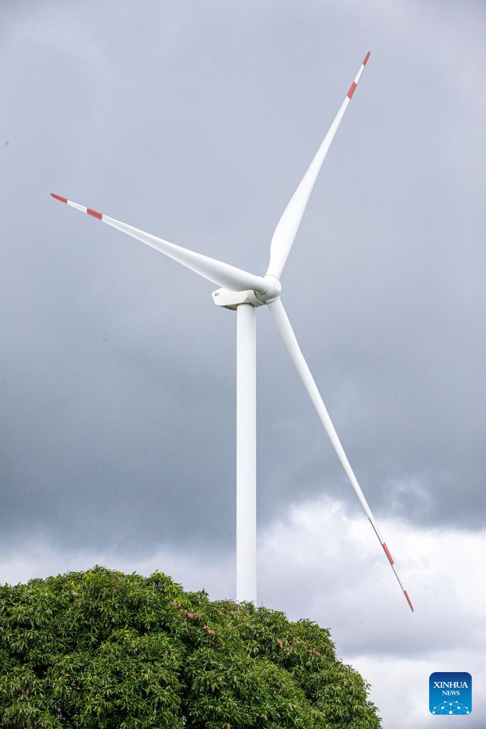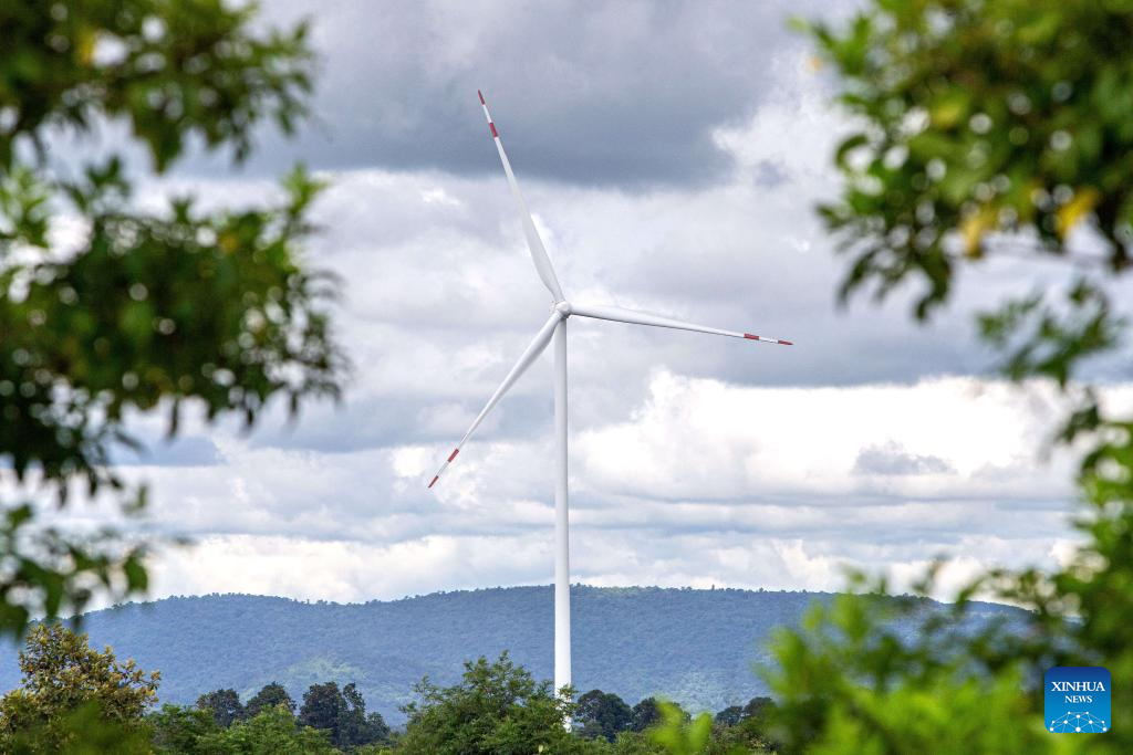 This photo taken on Oct. 5, 2023 shows a China's Goldwind wind turbine in Chaiyaphum, Thailand. The Chaiyaphum wind farm hosts 32 of China's Goldwind wind turbines with a total capacity of 80 MW and is operated by EGCO, a major energy producer affiliated to the largest state utility Electricity Generating Authority of Thailand. (Xinhua/Wang Teng)