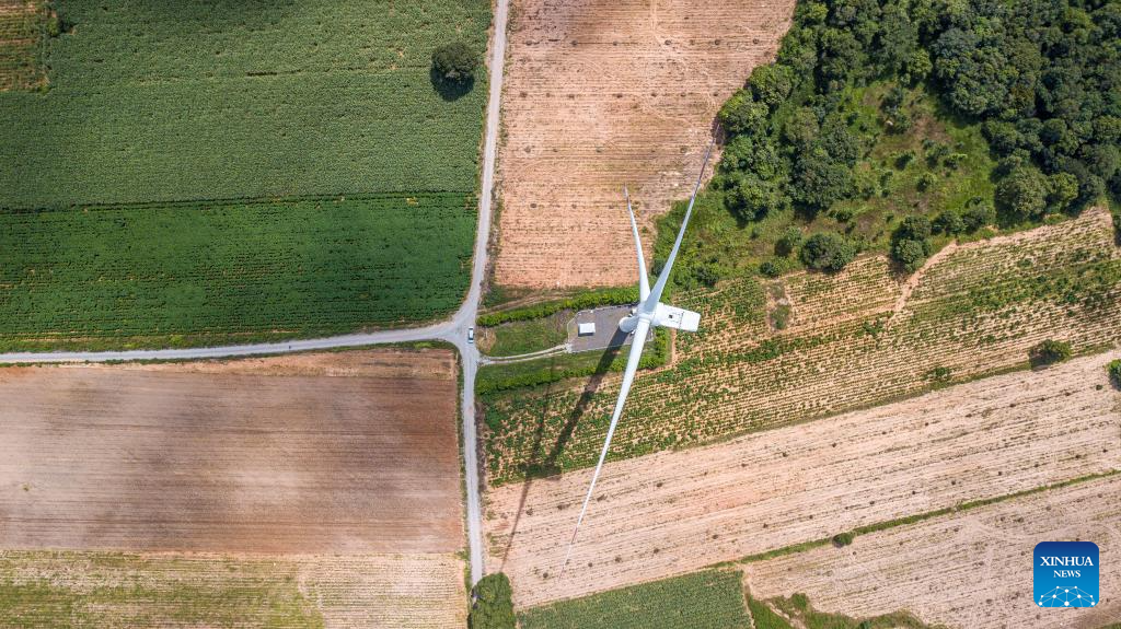 This aerial photo taken on Oct. 5, 2023 shows a China's Goldwind wind turbine in Chaiyaphum, Thailand. The Chaiyaphum wind farm hosts 32 of China's Goldwind wind turbines with a total capacity of 80 MW and is operated by EGCO, a major energy producer affiliated to the largest state utility Electricity Generating Authority of Thailand. (Xinhua/Wang Teng)