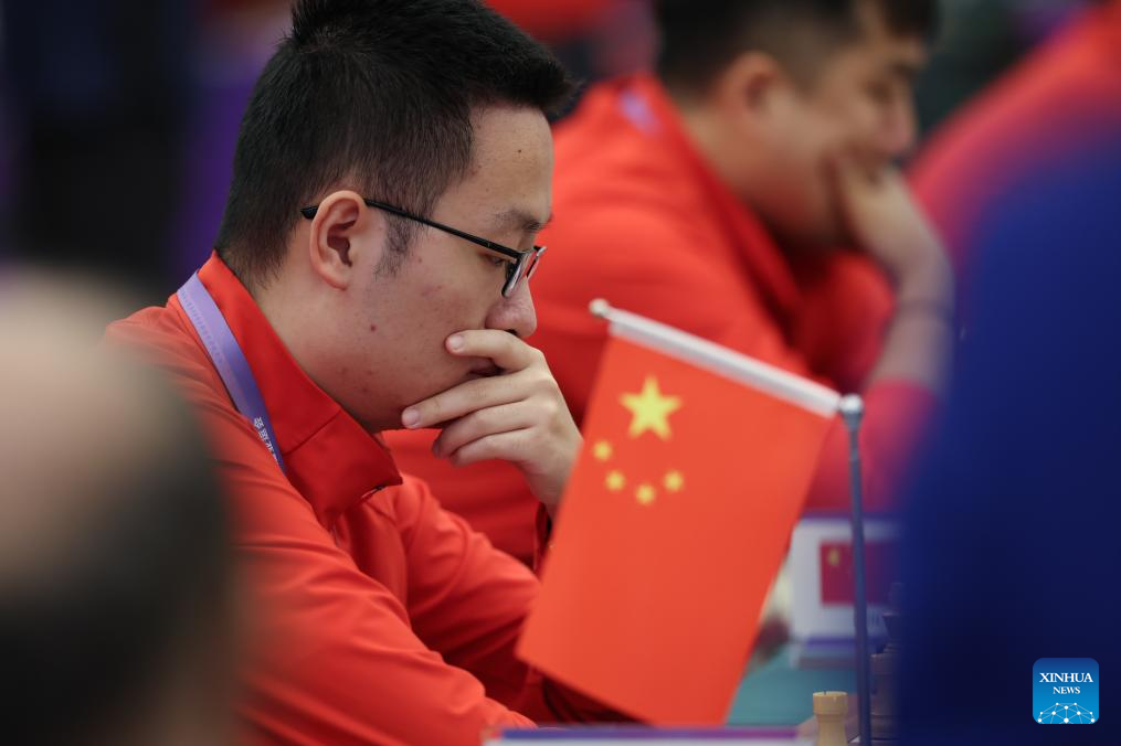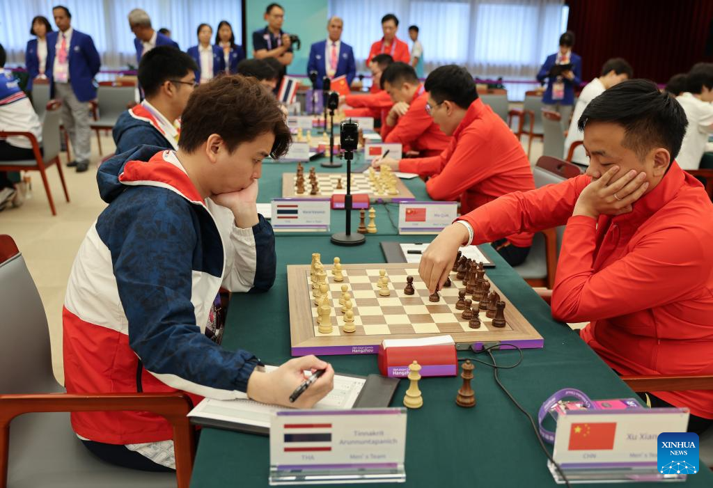 Xu Xiangyu (1st R) of China competes during the Men's Team round 7 of Chess between China and Thailand at the 19th Asian Games in Hangzhou, east China's Zhejiang Province, Oct. 5, 2023. (Xinhua/Gong Bing)