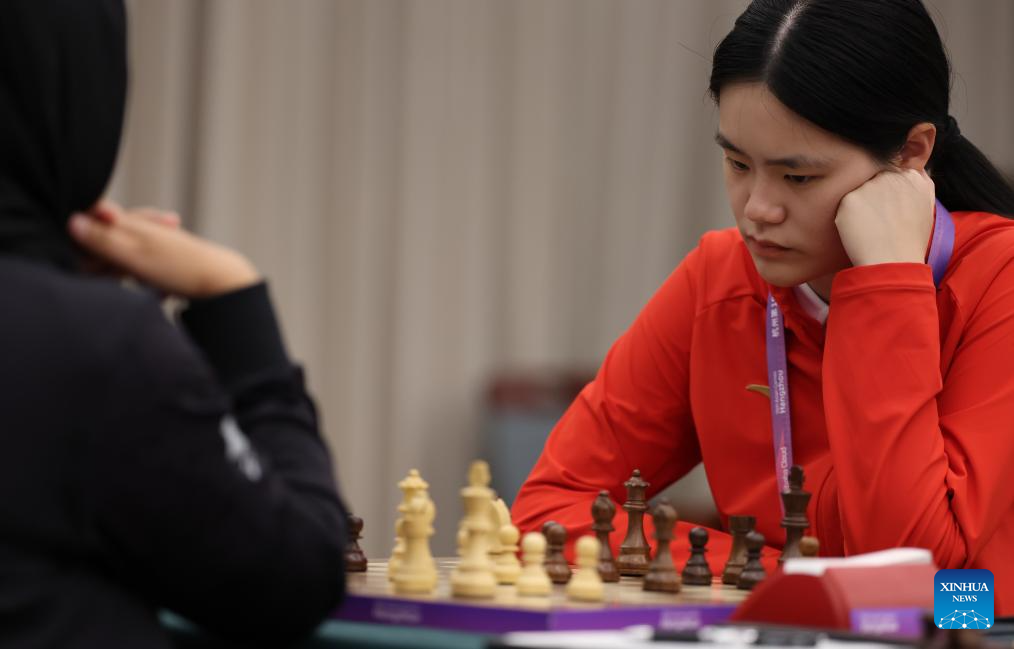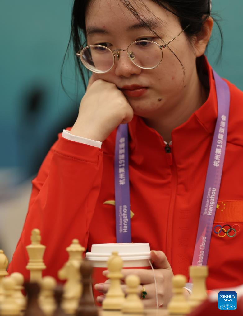 Tan Zhongyi of China competes during the Women's Team round 7 of Chess between China and Indonesia at the 19th Asian Games in Hangzhou, east China's Zhejiang Province, Oct. 5, 2023. (Xinhua/Gong Bing)
