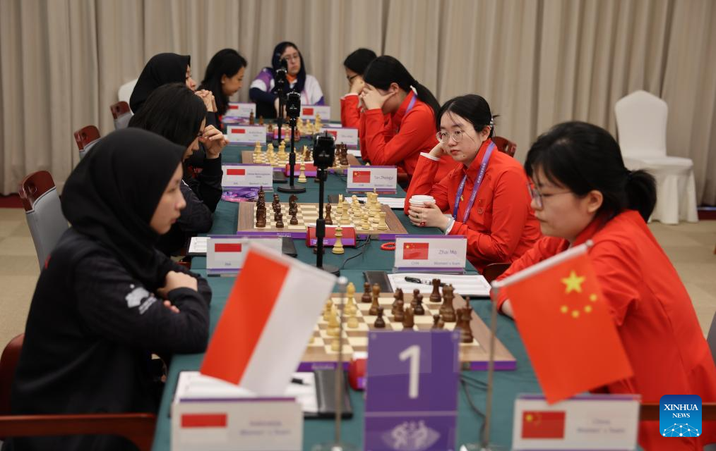 Team China compete against Team Indonesia during the Women's Team round 7 of Chess at the 19th Asian Games in Hangzhou, east China's Zhejiang Province, Oct. 5, 2023. (Xinhua/Gong Bing)