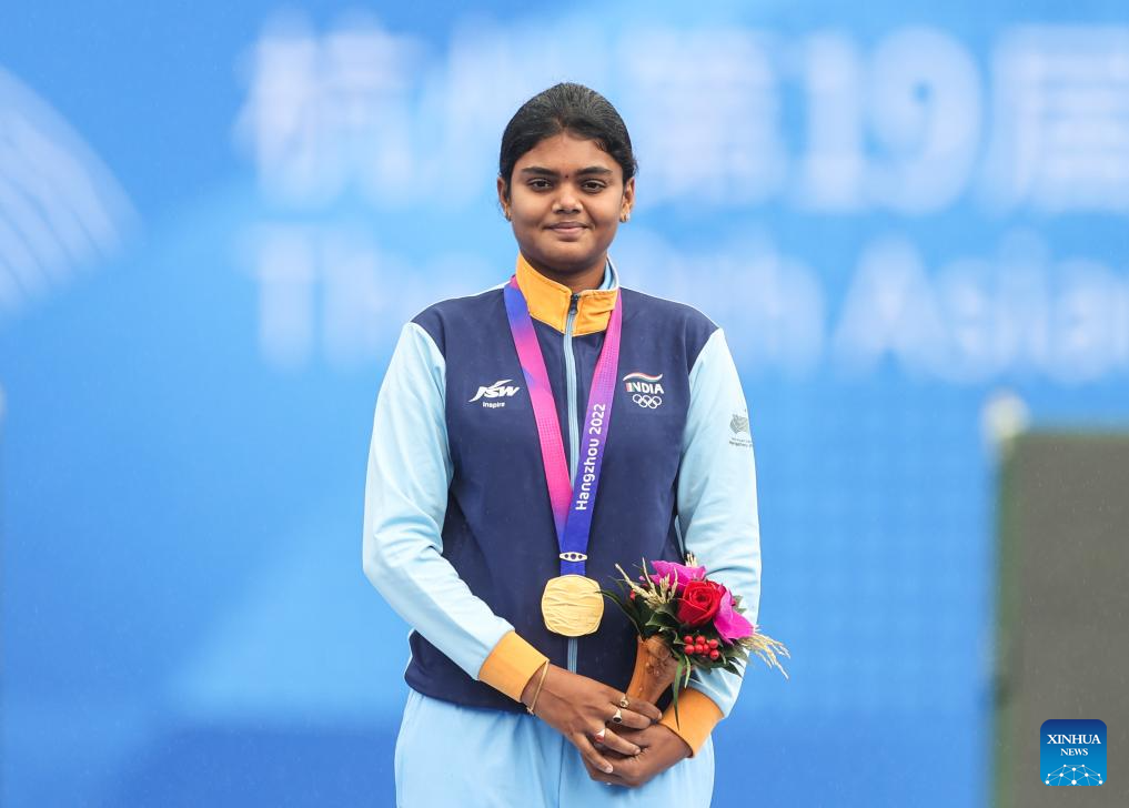 Gold medalist Jyothi Surekha Vennam of India attends the awarding ceremony for the Compound Women's Individual of Archery at the 19th Asian Games in Hangzhou, east China's Zhejiang Province, Oct. 7, 2023. (Xinhua/Shan Yuqi)