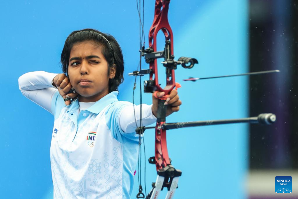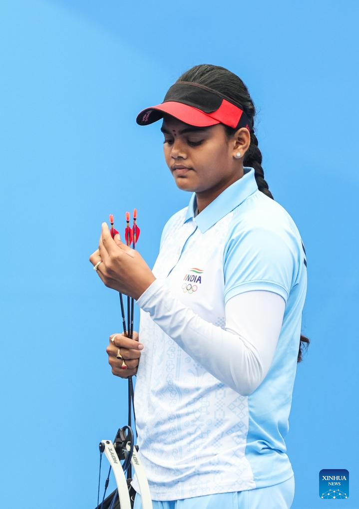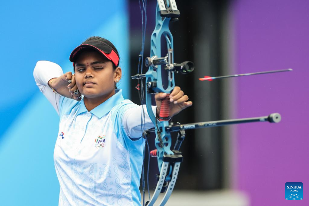 Jyothi Surekha Vennam of India is seen during the Compound Women's Individual Gold Medal Match of Archery at the 19th Asian Games in Hangzhou, east China's Zhejiang Province, Oct. 7, 2023. (Xinhua/Shan Yuqi)