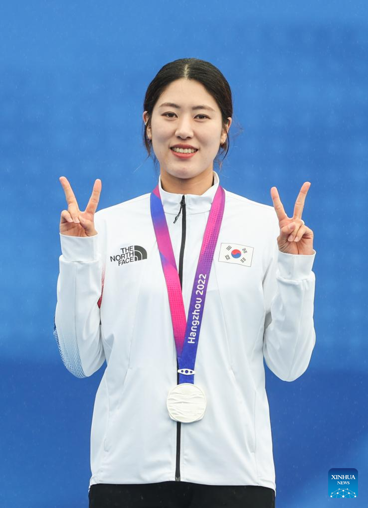 Silver medalist So Chaewon of South Korea attends the awarding ceremony for the Compound Women's Individual of Archery at the 19th Asian Games in Hangzhou, east China's Zhejiang Province, Oct. 7, 2023. (Xinhua/Shan Yuqi)