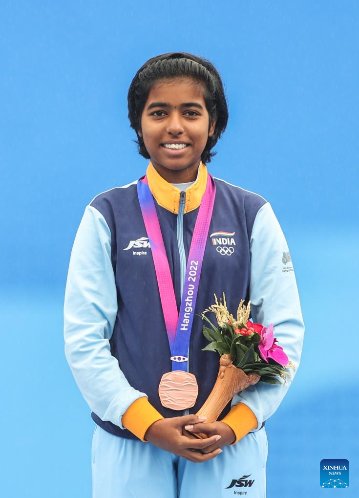Bronze medalist Aditi Gopichand Swami of India attends the awarding ceremony for the Compound Women's Individual of Archery at the 19th Asian Games in Hangzhou, east China's Zhejiang Province, Oct. 7, 2023. (Xinhua/Shan Yuqi)