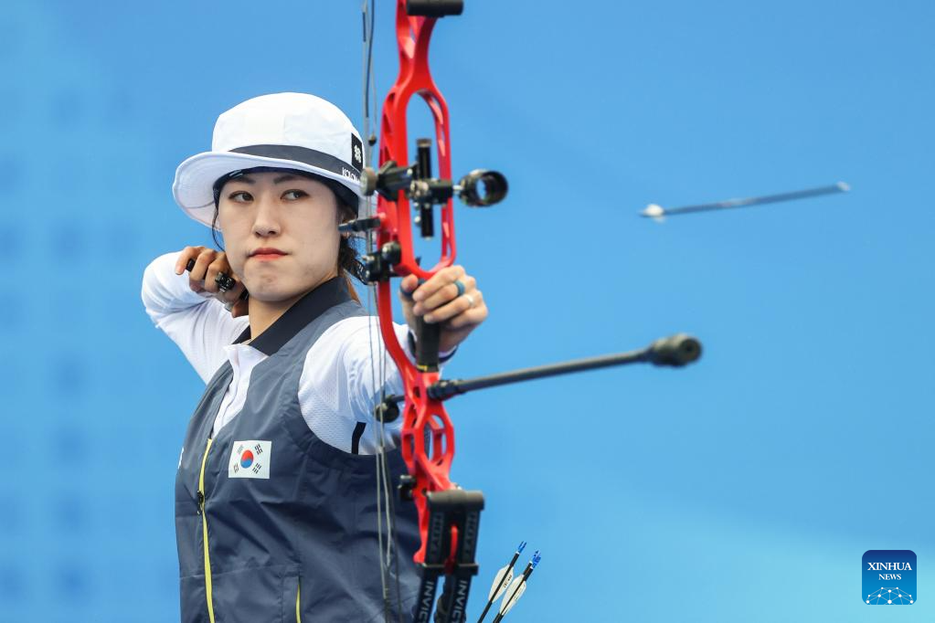 So Chaewon of South Korea competes during the Compound Women's Individual Gold Medal Match of Archery at the 19th Asian Games in Hangzhou, east China's Zhejiang Province, Oct. 7, 2023. (Xinhua/Shan Yuqi)