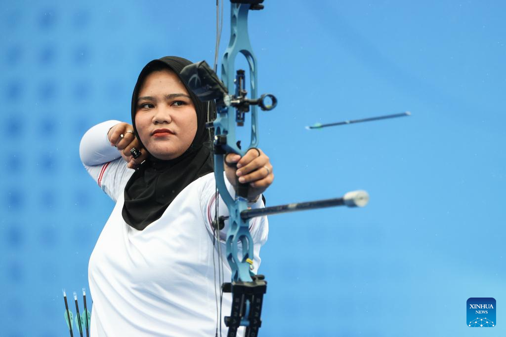 Ratih Zilizati Fadhly of Indonesia competes during the Compound Women's Individual Bronze Medal Match of Archery at the 19th Asian Games in Hangzhou, east China's Zhejiang Province, Oct. 7, 2023. (Xinhua/Shan Yuqi)