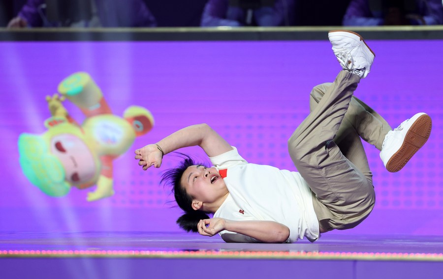 Liu Qingyi of China in action during the women's breakdancing gold medal battle at the 19th Asian Games in Hangzhou, Oct. 7, 2023. (Xinhua/Wang Kaiyan)