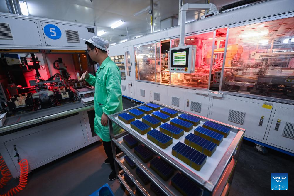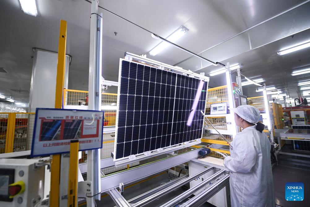 A staff member checks photovoltaic modules at the workshop of Hengdian Group DMEGC Magnetics Co., Ltd. in Dongyang City, east China's Zhejiang Province, April 18, 2023. Dirk Heil, a resident living in the small town of Schwarzenbek in Schleswig-Holstein, Germany, has been using solar-powered equipment made by Chinese companies in recent months. Thanks to the Belt and Road Initiative, these high-quality and fair-priced products from China have entered German households by sea or by taking China-Europe freight trains.