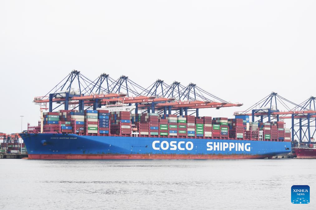 A container ship of China's COSCO Shipping docks at the Port of Rotterdam, the Netherlands, May 1, 2023. The Chinese-made solar-powered equipment installed in Dirk's house arrived by sea at the Port of Rotterdam before being transferred to Germany. Dirk Heil, a resident living in the small town of Schwarzenbek in Schleswig-Holstein, Germany, has been using solar-powered equipment made by Chinese companies in recent months. Thanks to the Belt and Road Initiative, these high-quality and fair-priced products from China have entered German households by sea or by taking China-Europe freight trains.