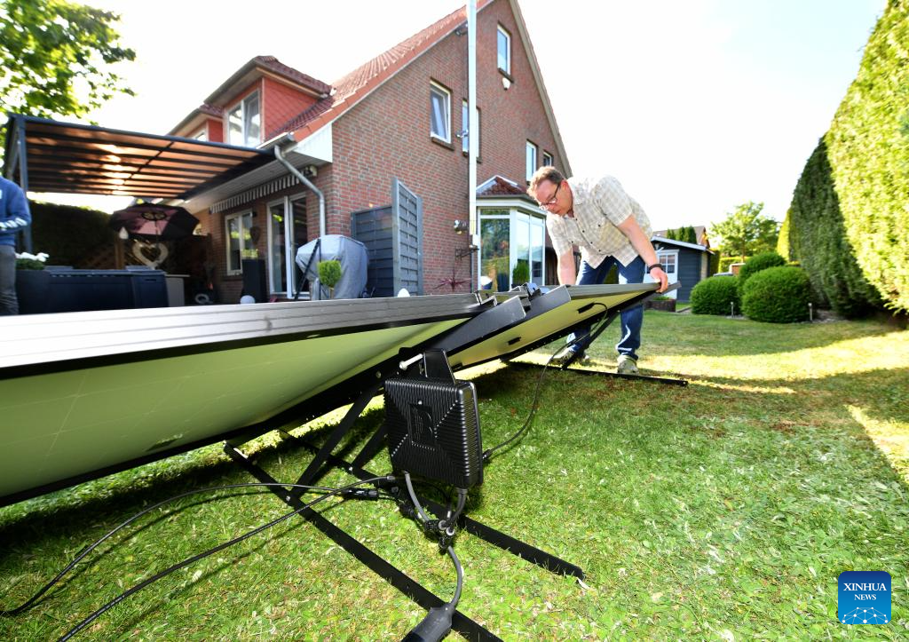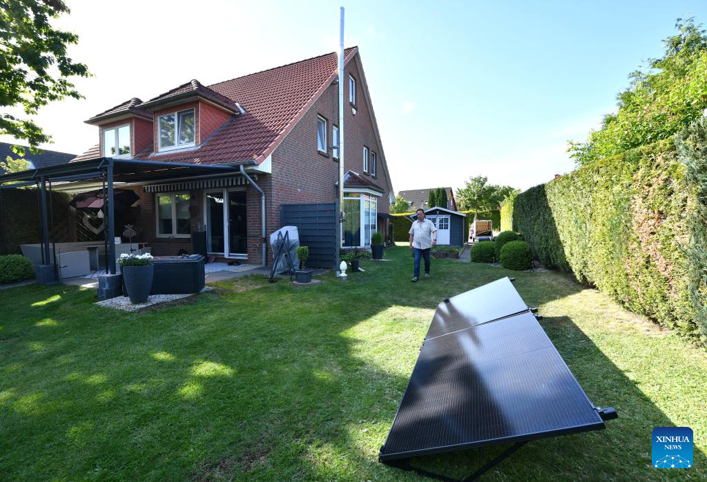 This photo taken on May 30, 2023 shows the Chinese-made solar-powered equipment installed at the house of Dirk Heil in Schwarzenbek, Germany. Dirk Heil, a resident living in the small town of Schwarzenbek in Schleswig-Holstein, Germany, has been using solar-powered equipment made by Chinese companies in recent months. Thanks to the Belt and Road Initiative, these high-quality and fair-priced products from China have entered German households by sea or by taking China-Europe freight trains.