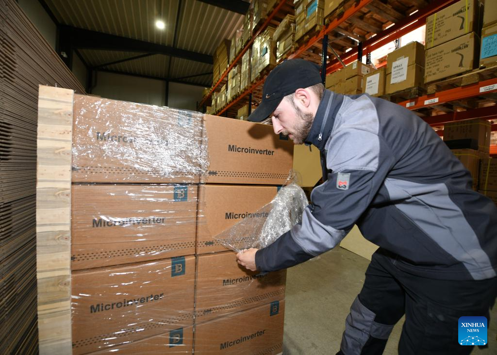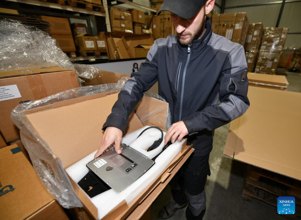 A staff member takes out a Chinese-made micro inverter from the batch packaging at the warehouse of Lauxx Energy in Ahrensburg, Germany, May 30, 2023. Dirk Heil, a resident living in the small town of Schwarzenbek in Schleswig-Holstein, Germany, has been using solar-powered equipment made by Chinese companies in recent months. Thanks to the Belt and Road Initiative, these high-quality and fair-priced products from China have entered German households by sea or by taking China-Europe freight trains.