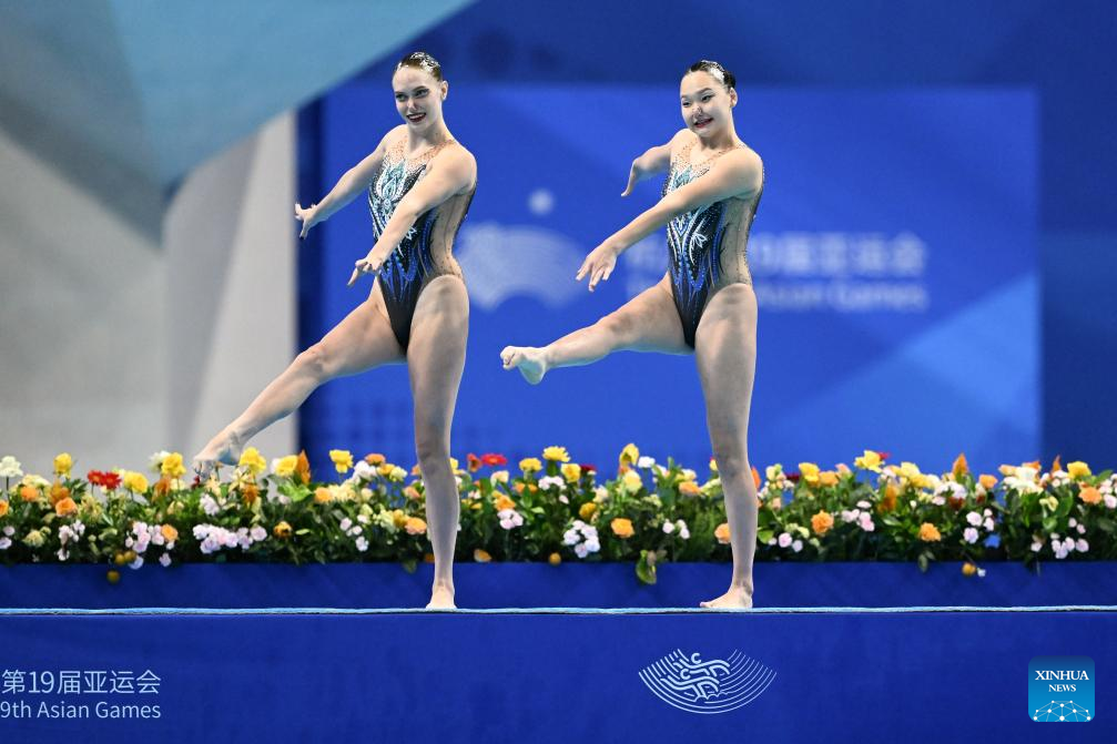 Kazakhstan's Yasmin Tuyakova /Arina Pushkina compete during the Duet Free Routine of Artistic Swimming at the 19th Asian Games in Hangzhou, east China's Zhejiang Province, Oct. 7, 2023. (Xinhua/Xue Yuge)