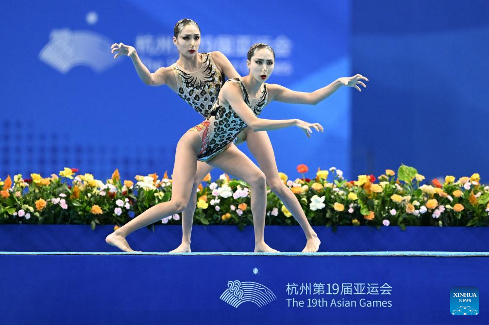 HANGZHOU, Oct. 7 (Xinhua) -- China's twin sisters Wang Qianyi and Wang Liuyi excelled to win the duet gold medal in artistic swimming at the Hangzhou Asian Games here on Saturday.
