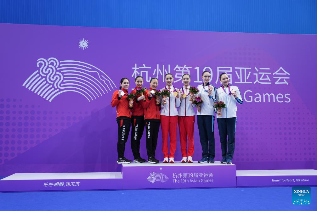 Gold medalists Team China (C), silver medalists Team Japan (L) and bronze medalists Team Kazakhstan attend the awarding ceremony for the Duet Free Routine of Artistic Swimming at the 19th Asian Games in Hangzhou, east China's Zhejiang Province, Oct. 7, 2023. (Xinhua/Xue Yuge)