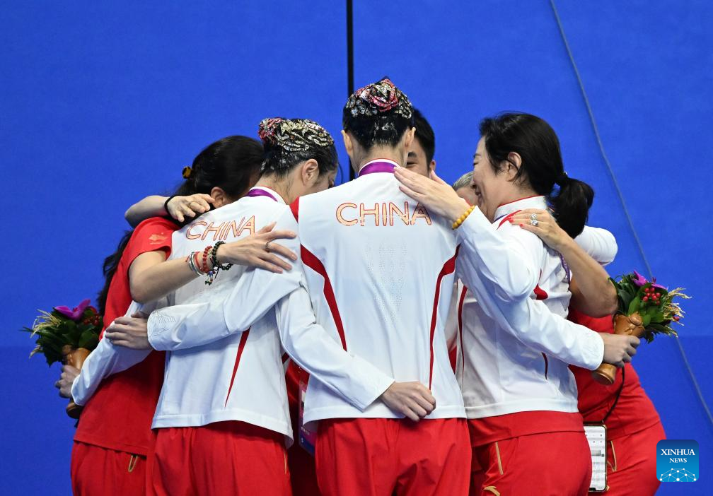 Team China celebrate during the awarding ceremony for the Duet Free Routine of Artistic Swimming at the 19th Asian Games in Hangzhou, east China's Zhejiang Province, Oct. 7, 2023. (Xinhua/Xue Yuge)