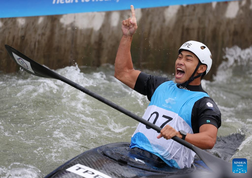 Wu Shao-Hsuan of Chinese Taipei celebrates after the Men's Kayak Final of Canoe Slalom at the 19th Asian Games in Hangzhou, east China's Zhejiang Province, Oct. 7, 2023. (Xinhua/Du Xiaoyi)