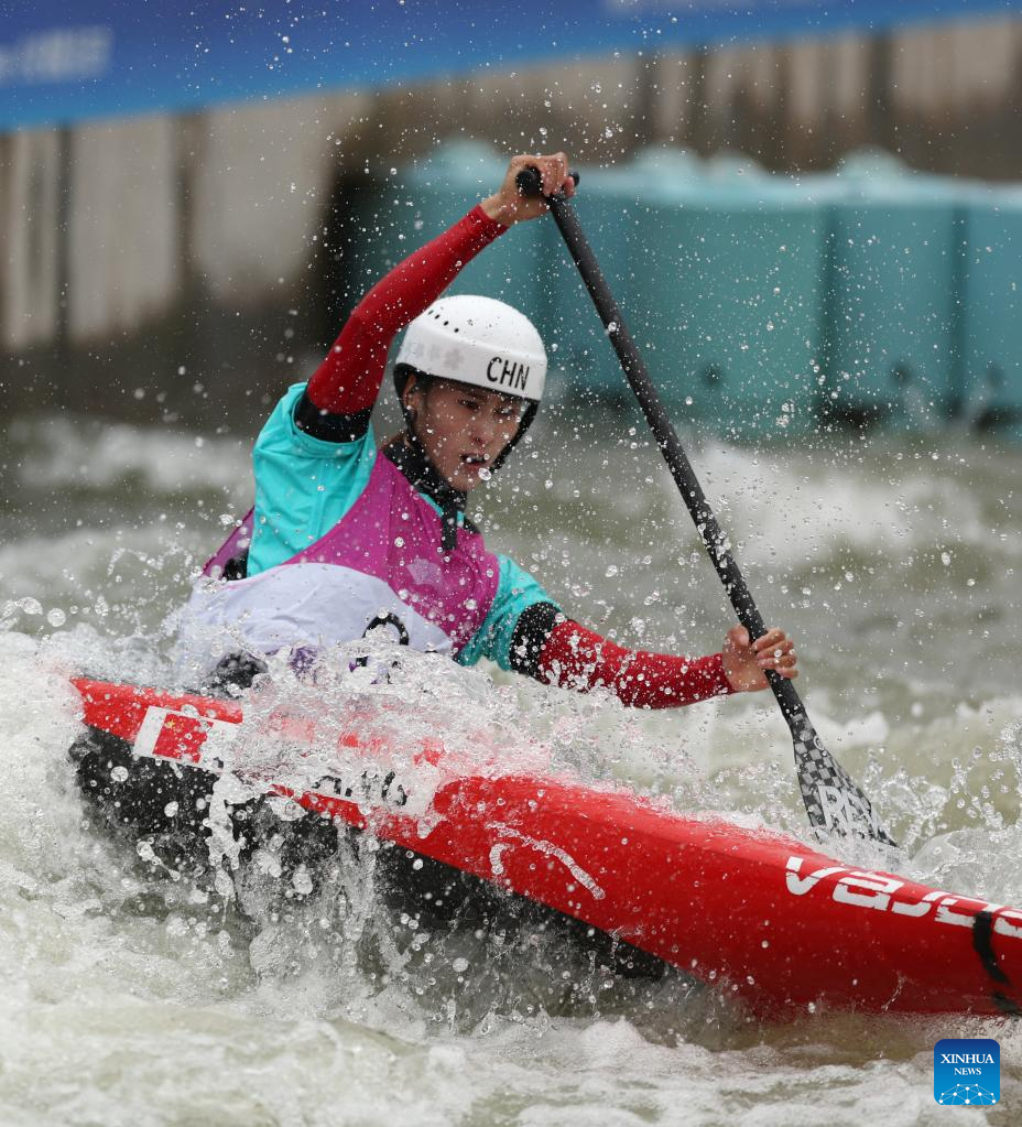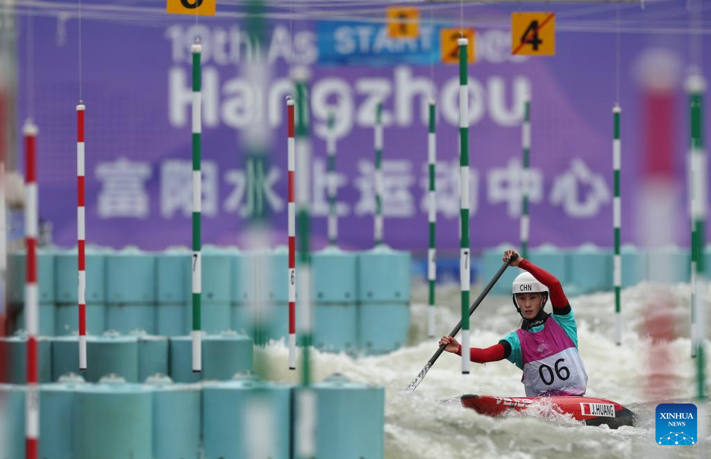 Huang Juan of China competes during the Women's Canoe Final of Canoe Slalom at the 19th Asian Games in Hangzhou, east China's Zhejiang Province, Oct. 7, 2023. (Xinhua/Du Xiaoyi)