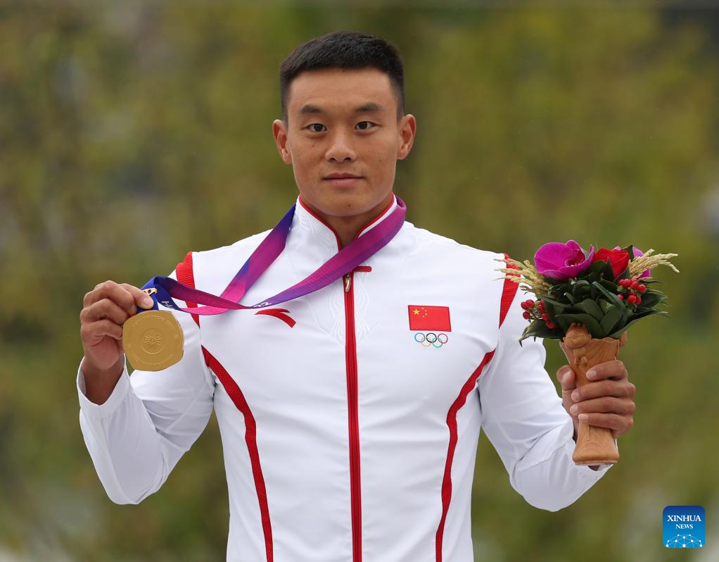 Gold medalist Quan Xin of China attends the awarding ceremony for the Men's Kayak of Canoe Slalom at the 19th Asian Games in Hangzhou, east China's Zhejiang Province, Oct. 7, 2023. (Xinhua/Du Xiaoyi)
