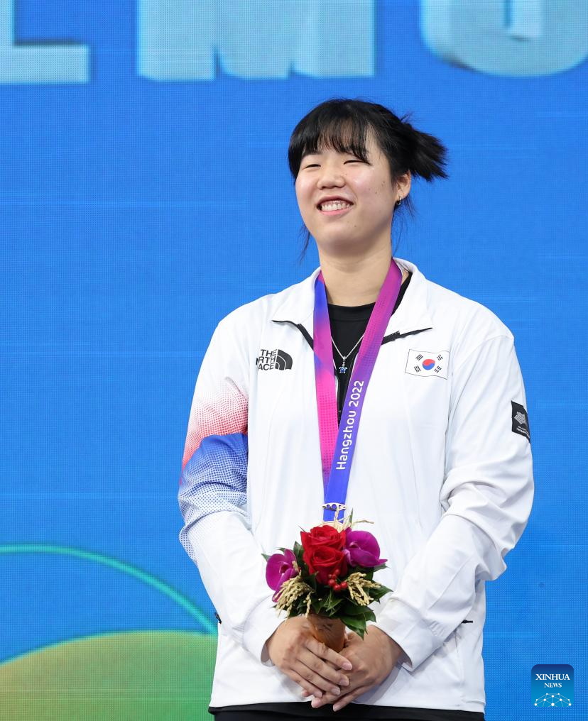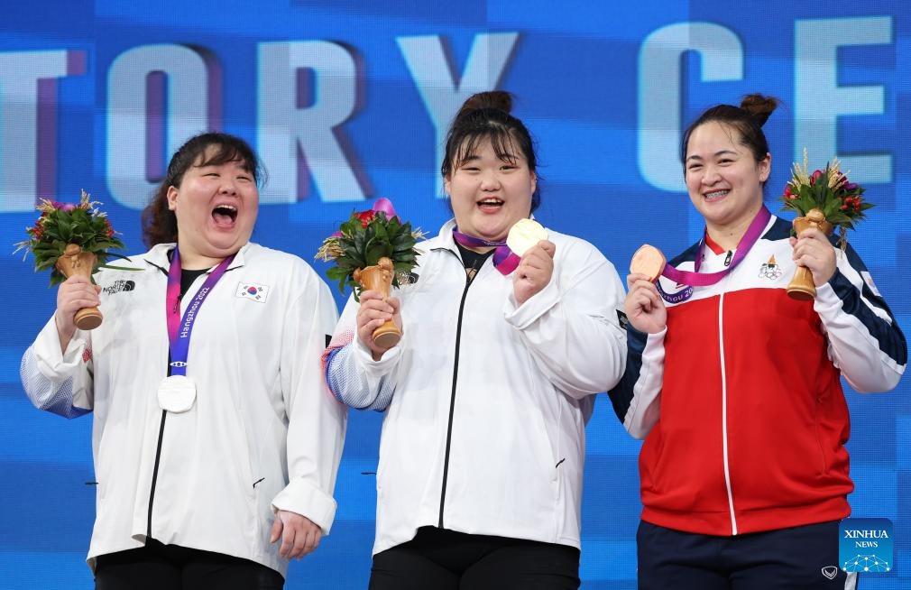 Gold Medalist Park Hyejeong of South Korea attends the awarding ceremony for the Women's +87Kg of Weightlifting at the 19th Asian Games in Hangzhou, east China's Zhejiang Province, Oct. 7, 2023. (Xinhua/Yang Lei)