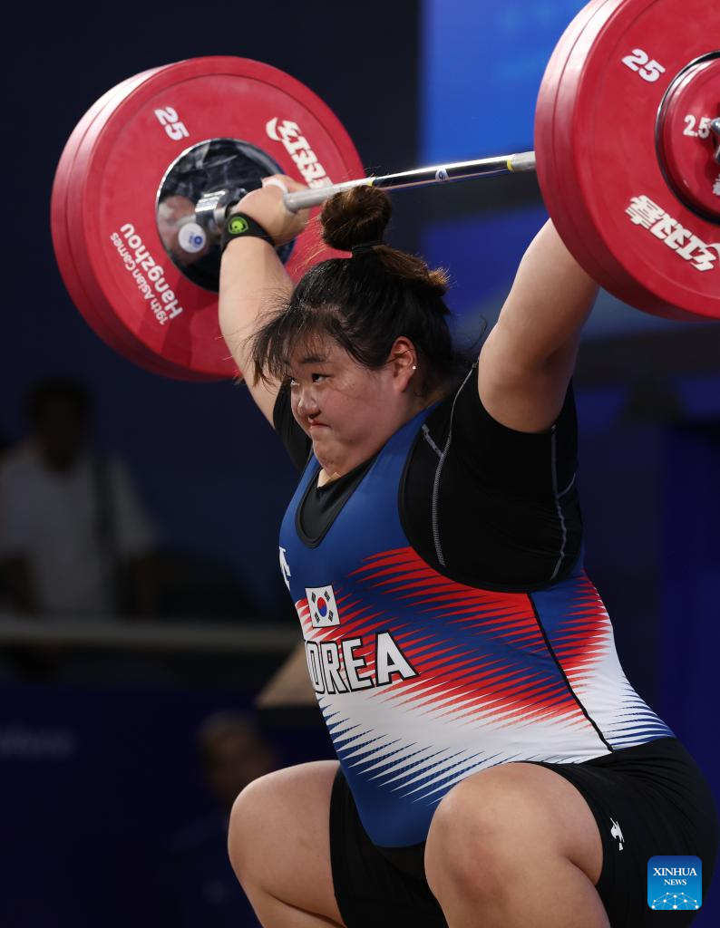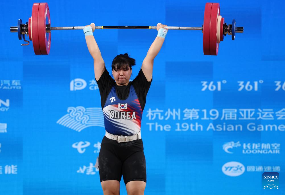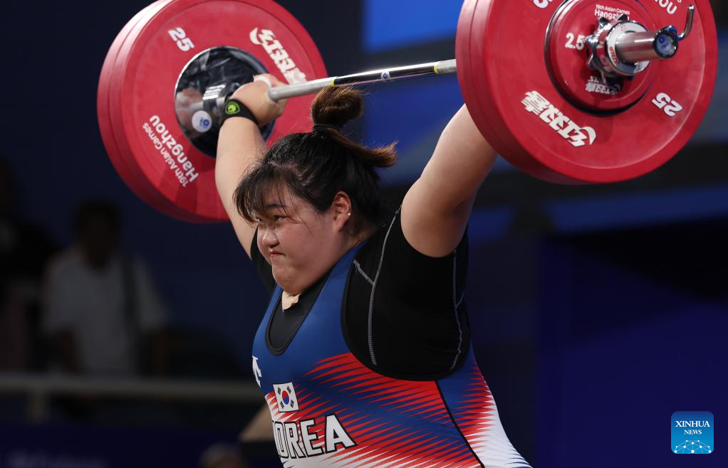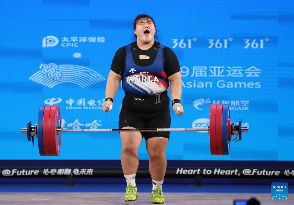 Jung Aram of South Korea competes during Women's 87Kg Group A match of Weightlifting at the 19th Asian Games in Hangzhou, east China's Zhejiang Province, Oct. 6, 2023. (Xinhua/Yang Lei)