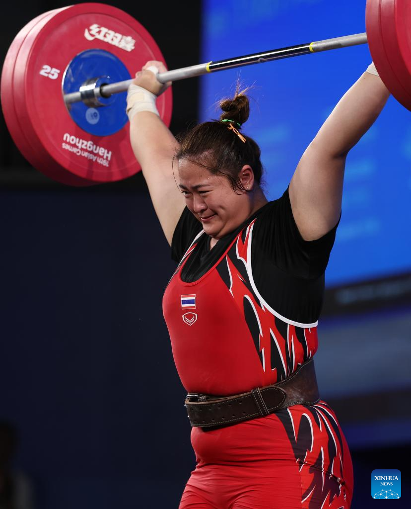 Duangaksorn Chaidee of Thailand competes during the Women's +87Kg of Weightlifting at the 19th Asian Games in Hangzhou, east China's Zhejiang Province, Oct. 7, 2023. (Xinhua/Yang Lei)