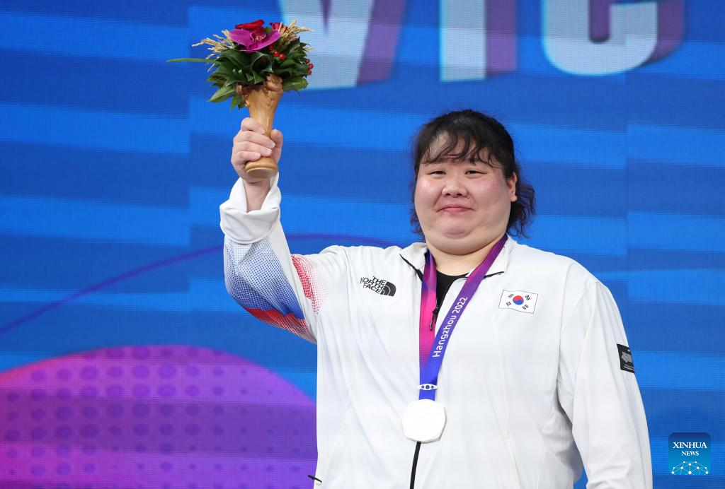 Silver medalist Son Younghee of South Korea attends the awarding ceremony for the Women's +87Kg of Weightlifting at the 19th Asian Games in Hangzhou, east China's Zhejiang Province, Oct. 7, 2023. (Xinhua/Yang Lei)