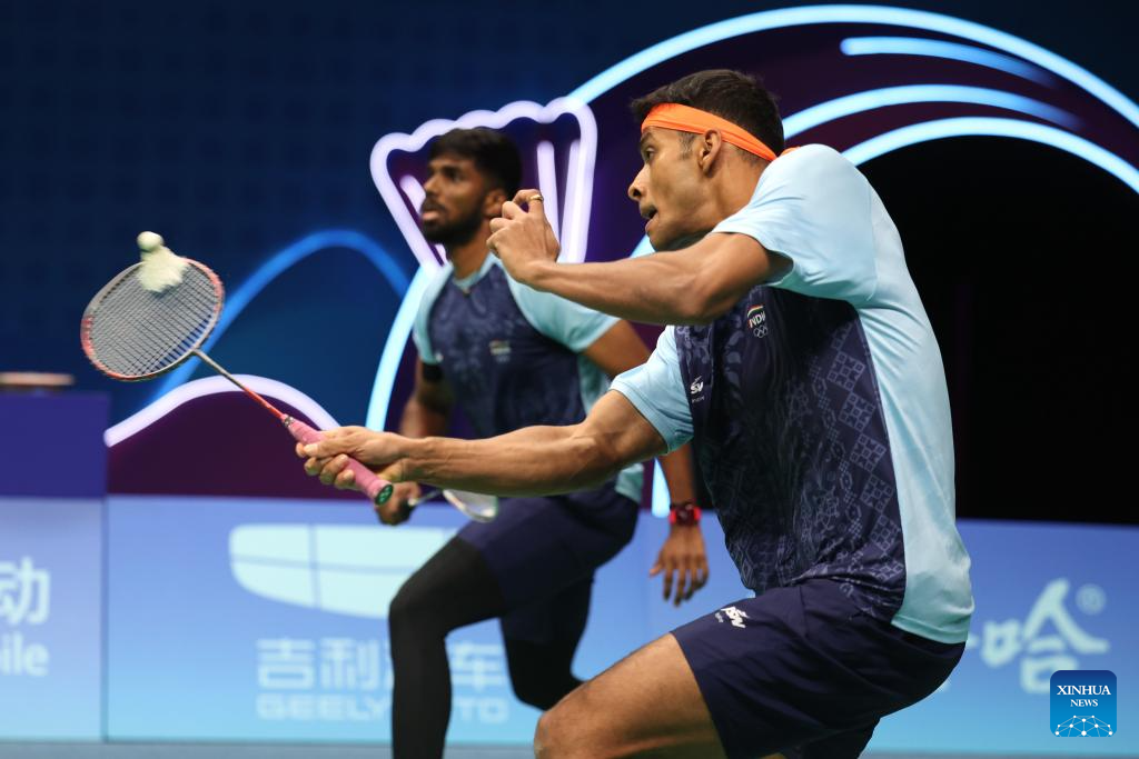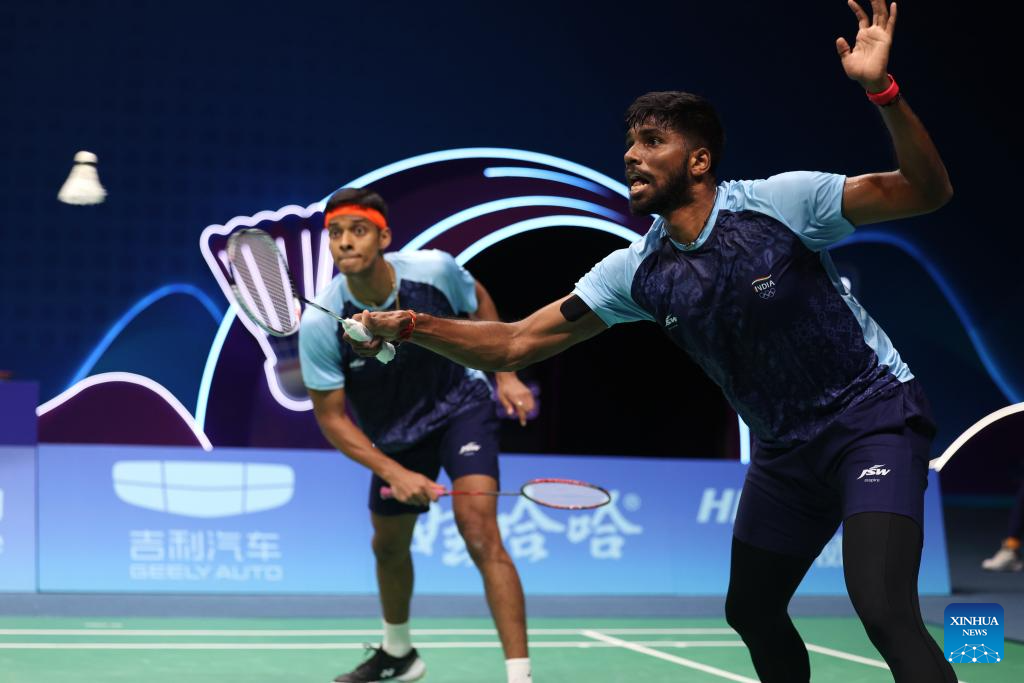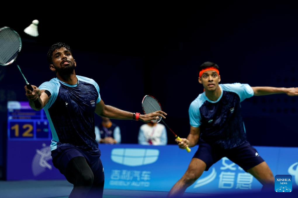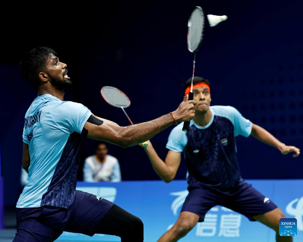 Satwik Sairaj Rankireddy (L) /Chirag Chandrashekhar Shetty of India compete during the Men's Doubles Gold Medal Match of Badminton between Choi Solgyu/Kim Wonho of South Korea and Satwik Sairaj Rankireddy/Chirag Chandrashekhar Shetty of India at the 19th Asian Games in Hangzhou, east China's Zhejiang Province, Oct. 7, 2023. (Xinhua/Ren Zhenglai)