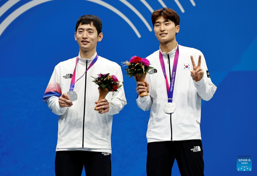 Sliver medalists Choi Solgyu (L)/Kim Wonho of South Korea attend the awarding ceremony for the Men's Doubles of Badminton at the 19th Asian Games in Hangzhou, east China's Zhejiang Province, Oct. 7, 2023. (Xinhua/Ren Zhenglai)