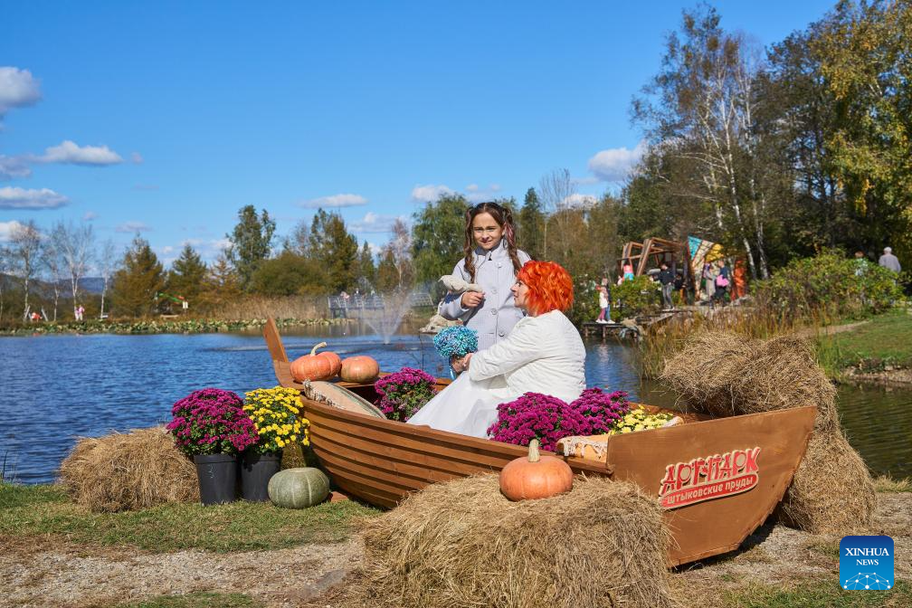 A couple pose for photos with a decoration at the pumpkin festival in Vladivostok, Russia, Oct. 7, 2023. A pumpkin festival was held on the outskirts of Vladivostok on Saturday to celebrate the harvest season. (Photo by Guo Feizhou/Xinhua)