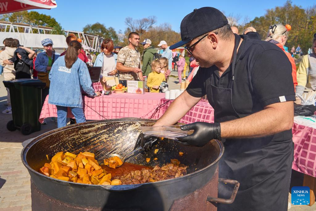 Pumpkin cuisines are seen at the pumpkin festival in Vladivostok, Russia, Oct. 7, 2023. A pumpkin festival was held on the outskirts of Vladivostok on Saturday to celebrate the harvest season. (Photo by Guo Feizhou/Xinhua)