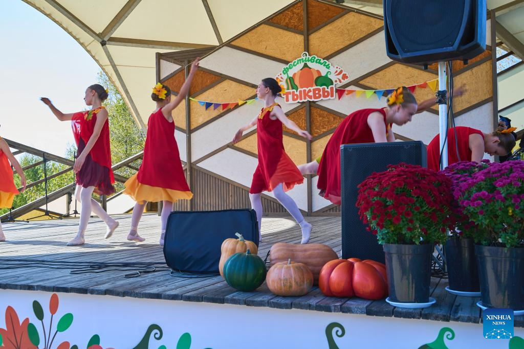 Performers dance at the pumpkin festival in Vladivostok, Russia, Oct. 7, 2023. A pumpkin festival was held on the outskirts of Vladivostok on Saturday to celebrate the harvest season. (Photo by Guo Feizhou/Xinhua)