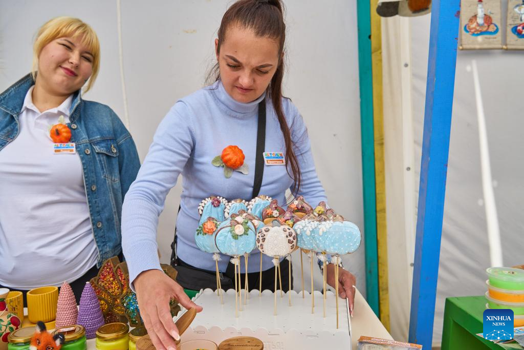 Women sell pumpkin-shaped candies at the pumpkin festival in Vladivostok, Russia, Oct. 7, 2023. A pumpkin festival was held on the outskirts of Vladivostok on Saturday to celebrate the harvest season. (Photo by Guo Feizhou/Xinhua)